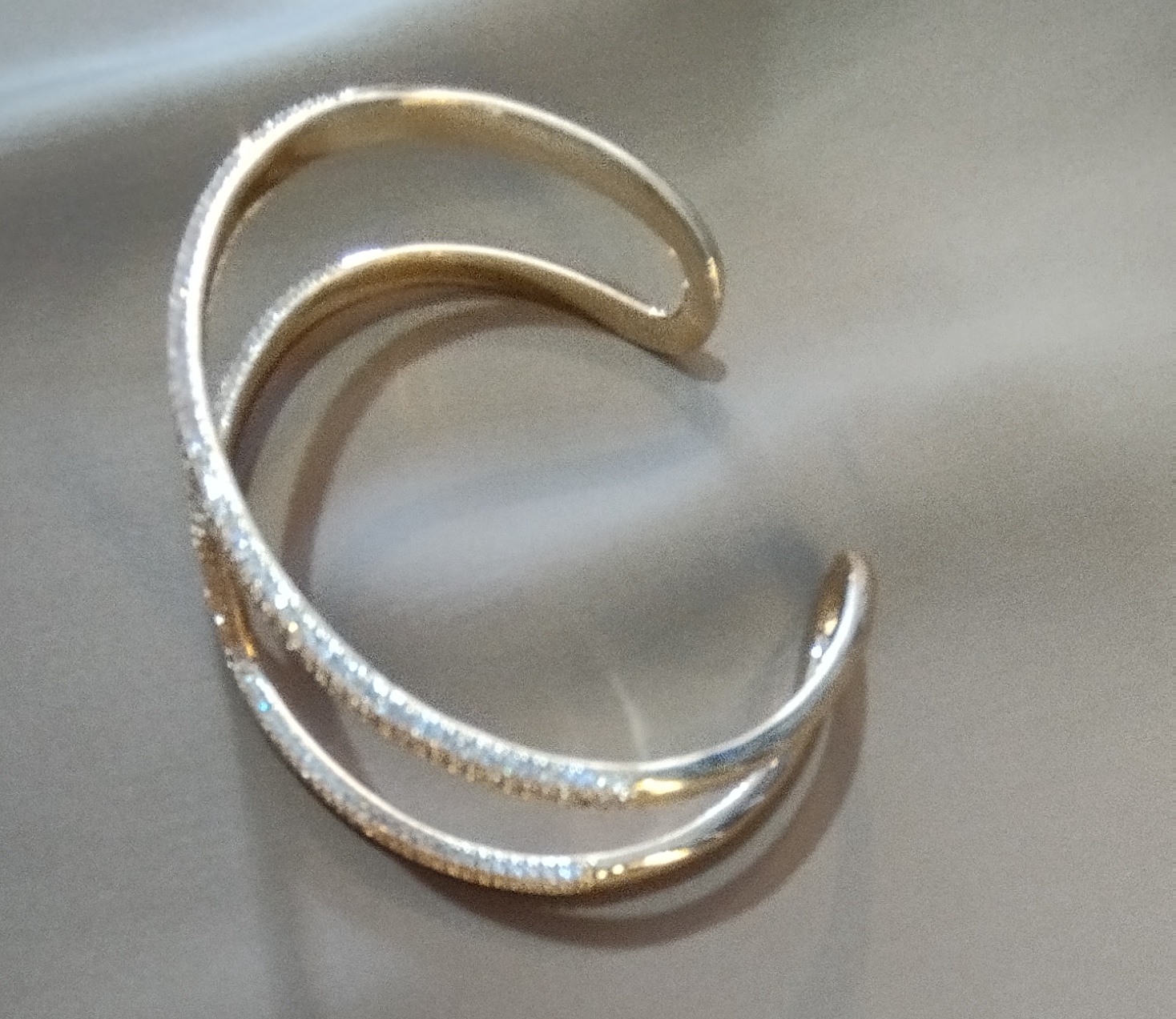 Bracelete de bijuteria com design moderno e sofisticado, composto por estrutura dourada e detalhes em curvas entrelaçadas. A peça ganha destaque pelo acabamento com microcristais brilhantes, que adicionam um toque de glamour e elegância. Seu formato aberto proporciona ajuste confortável ao pulso, tornando-o ideal para compor desde looks casuais até produções mais refinadas.