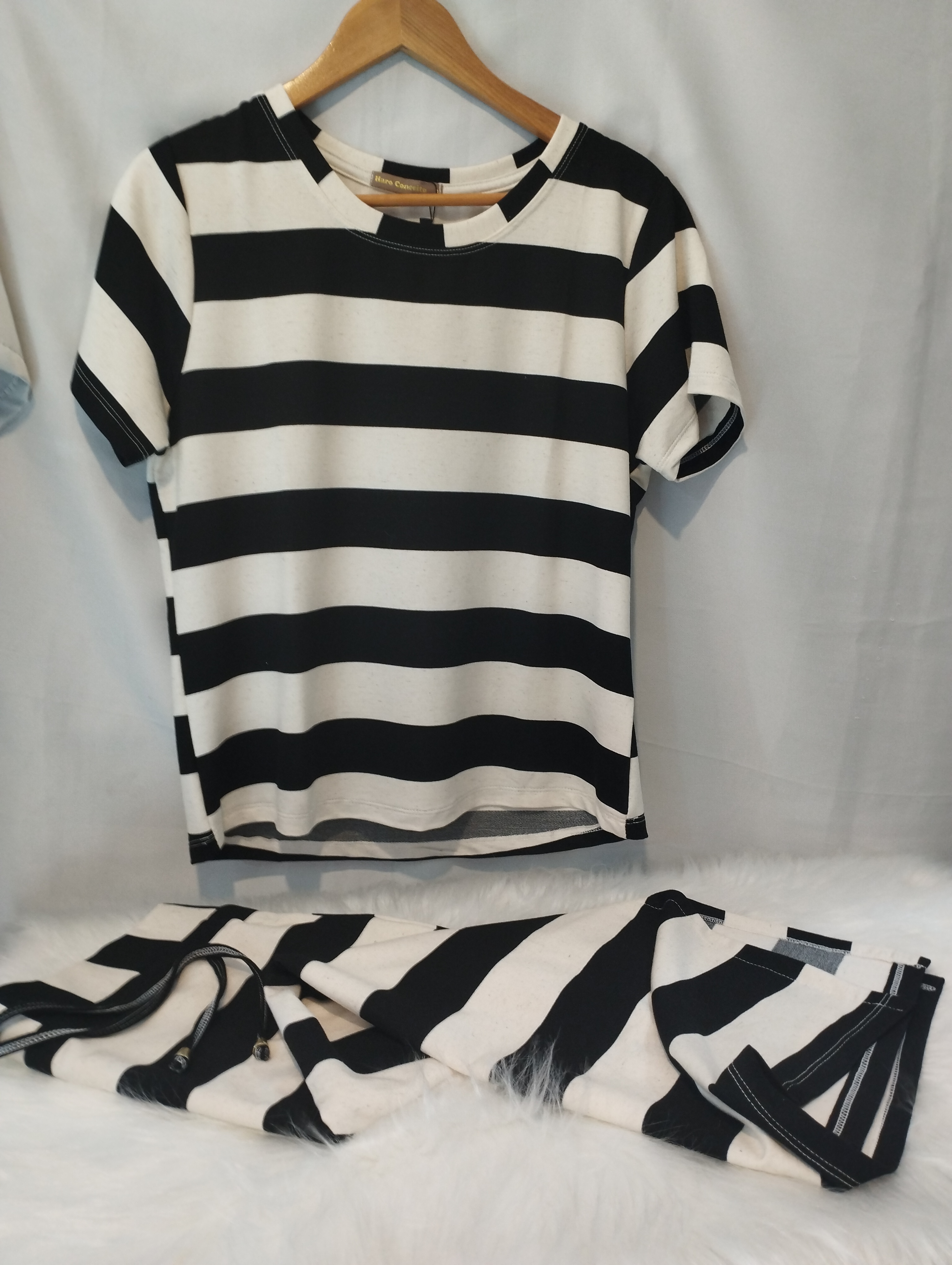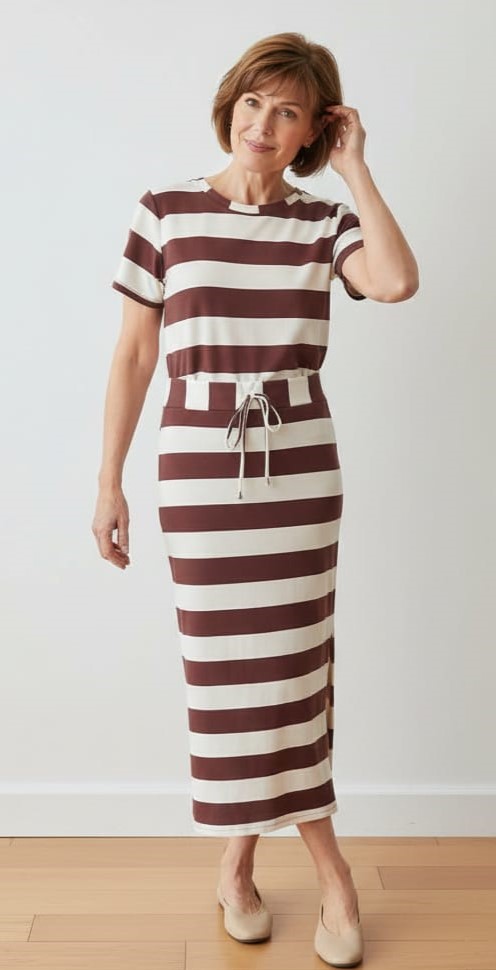 Conjunto de saia em moletinho listrado, com modelagem ajustada, fenda lateral e bolso faca funcional. Confortável, moderno e versátil para diversas ocasiões.
