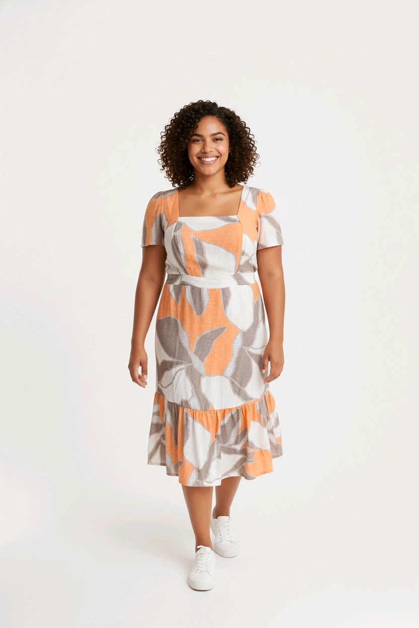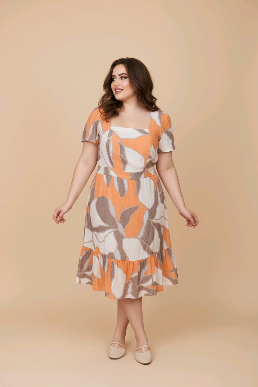 Vestido Midi Estampado Laranja Amêndoa Vestido midi com estampa exclusiva em mescla de laranja queimado, creme e amêndoa, trazendo um visual moderno e sofisticado na medida certa. O modelo possui decote quadrado que valoriza o colo, mangas curtas e modelagem acinturada que realça a silhueta com elegância. A saia em comprimento midi conta com recorte e leve babado na barra, proporcionando movimento e fluidez ao caminhar. O tecido leve garante conforto e caimento impecável, ideal para compor produções versáteis — do casual chic ao elegante para ocasiões especiais.