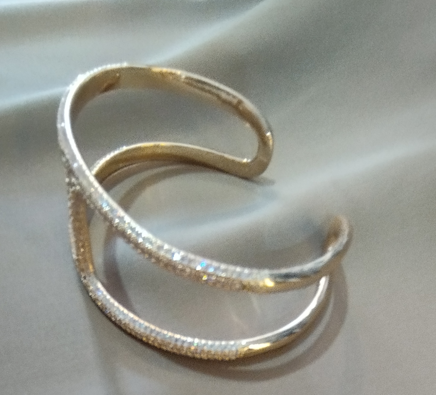 Bracelete de bijuteria com design moderno e sofisticado, composto por estrutura dourada e detalhes em curvas entrelaçadas. A peça ganha destaque pelo acabamento com microcristais brilhantes, que adicionam um toque de glamour e elegância. Seu formato aberto proporciona ajuste confortável ao pulso, tornando-o ideal para compor desde looks casuais até produções mais refinadas.