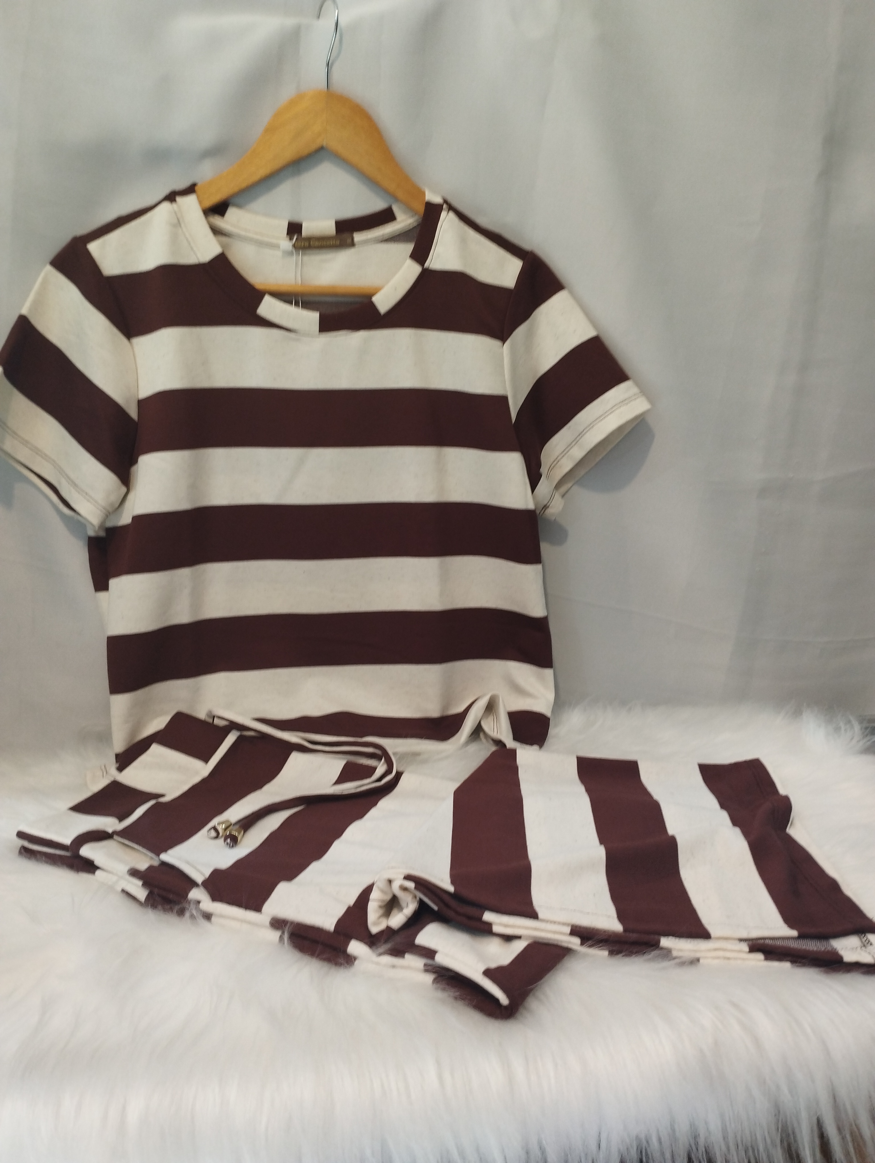Conjunto de saia em moletinho listrado que combina conforto e estilo em uma única produção. A saia possui modelagem ajustada, listras que alongam a silhueta e fenda lateral que valoriza o visual com um toque moderno e feminino. Conta também com bolso faca funcional, trazendo praticidade para o dia a dia. Confeccionado em moletinho macio e leve, é perfeito para composições casuais ou mais arrumadas, garantindo versatilidade e conforto em qualquer ocasião
